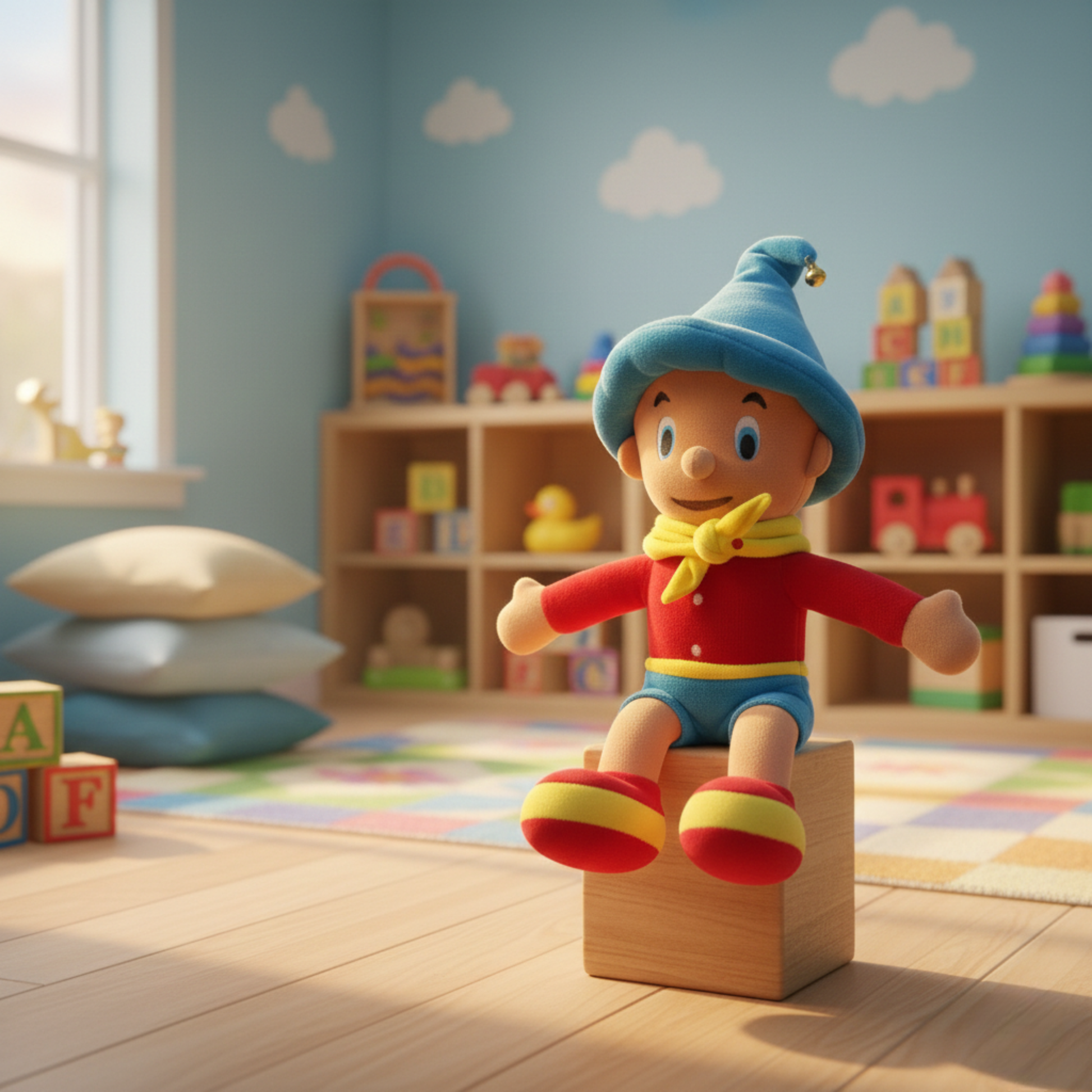 Add whimsical cheer to any space with the CARTOON PLUSH – HANGABLE SOFT TOY! This 42 cm plush doll features a bright blue hat with a bell, a friendly, smiling face, and a vibrant outfit finished in red, blue, and yellow. Crisply embroidered eyes and a round nose bring the character to life, while premium Indonesian fibre filling ensures plush comfort and shape retention. The convenient hanging loop on the back of the hat makes this plush perfect for display in bedrooms, playrooms, or even on travel bags—spreading smiles to all ages.