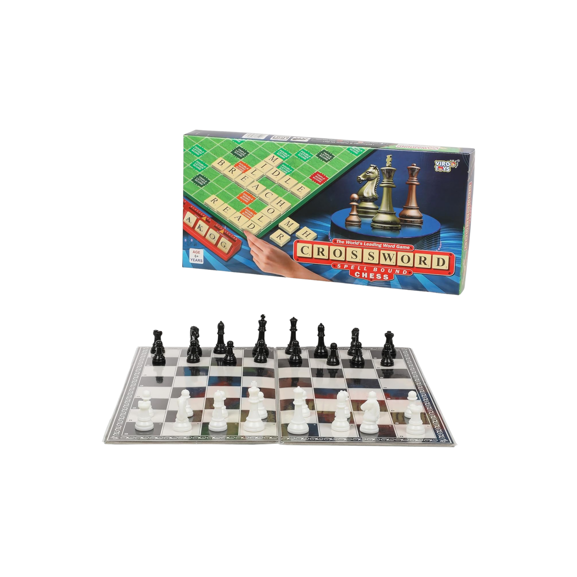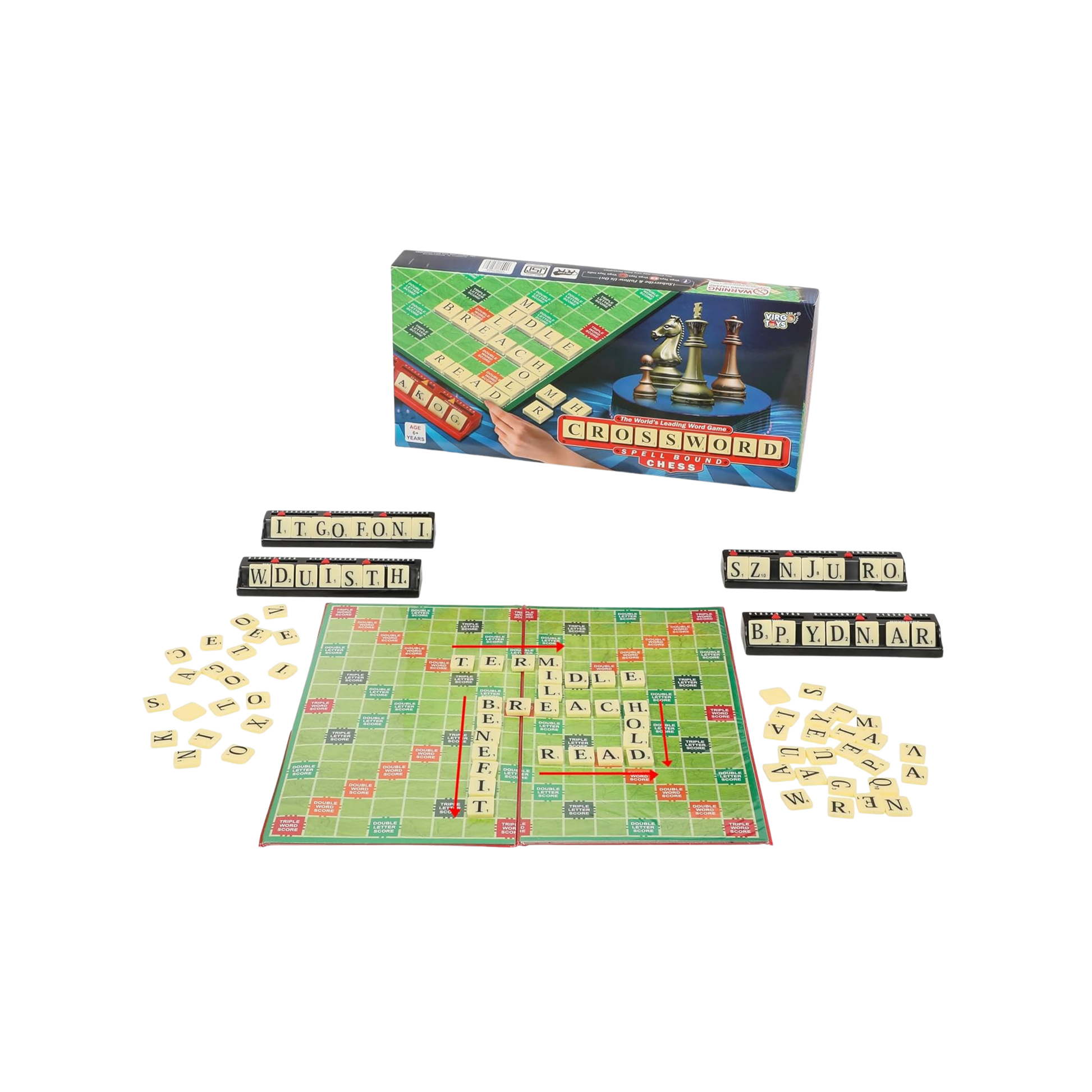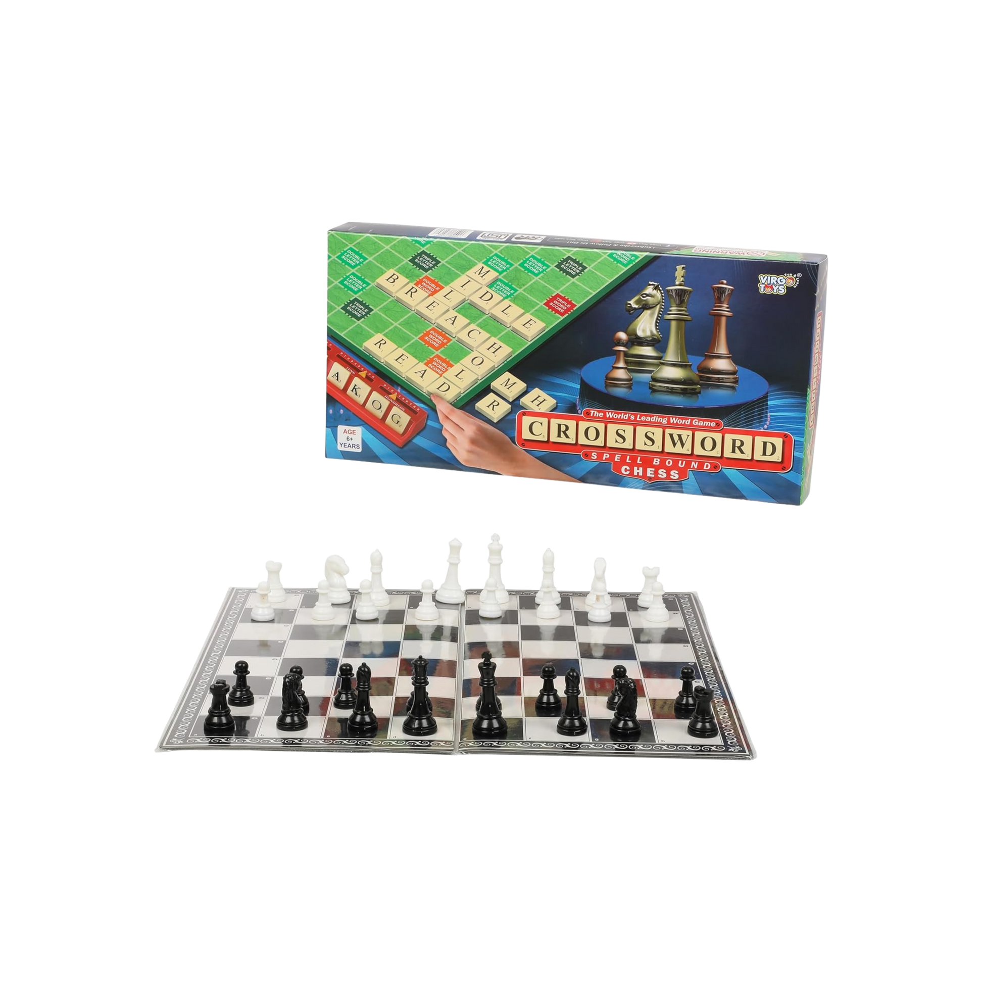 Experience the best of both strategic worlds with the CROSSWORD SPELLBOUND CHESS COMBO by Virgo Toys! This premium 2-in-1 game set combines the intellectual challenge of chess with the vocabulary-building excitement of crossword word games, offering endless entertainment for strategy enthusiasts and word lovers alike. The elegant packaging features both games in one convenient set – a complete crossword board game with letter tiles and tile racks, plus a full chess set with classic black and white pieces on a professional checkered board. Perfect for families who appreciate quality games, this combo provides hours of educational fun while developing critical thinking, vocabulary, and strategic planning skills.