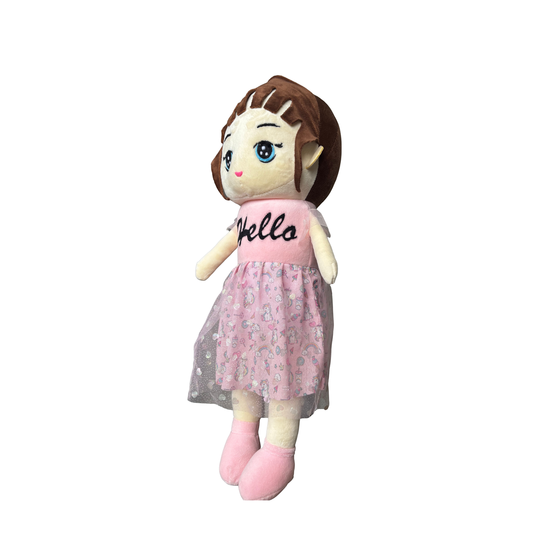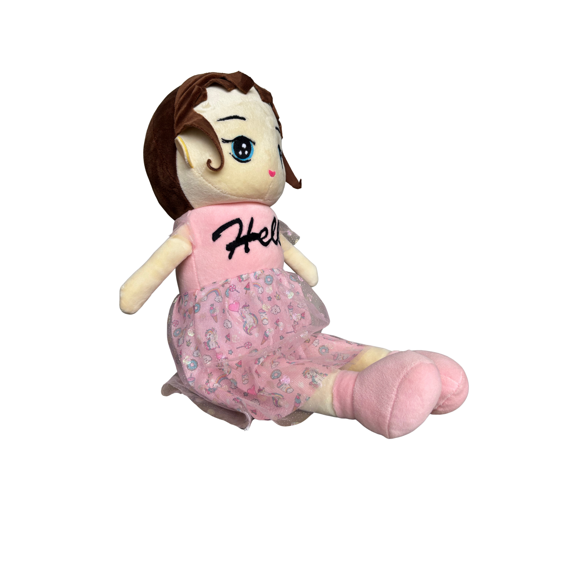 Brighten up any space with the HELLO PINK DOLL, a delightful 60 cm plush companion crafted for joyful hugs and beautiful décor! This charming soft doll features a sweet “Hello” embroidered top, big blue eyes, and a shimmery pink dress with playful unicorn and rainbow patterns. Soft brown hair and comfy pink shoes add to its adorable appeal. Made with premium Indonesian fibre, this hangable doll offers a cloud-like, huggable touch while staying lightweight and durable for all ages.