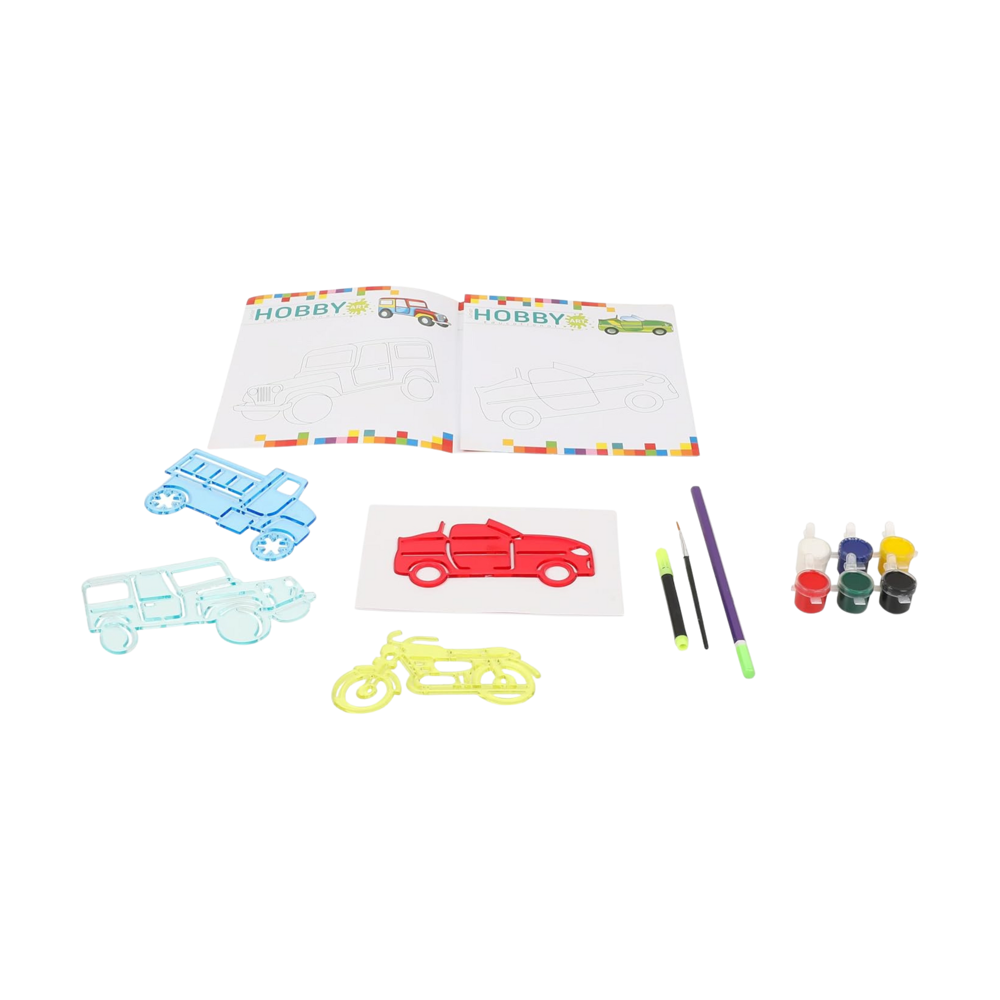 - Kit Contents: 4 vehicle stencils, 1 colouring book, 2 brushes, 6 paints