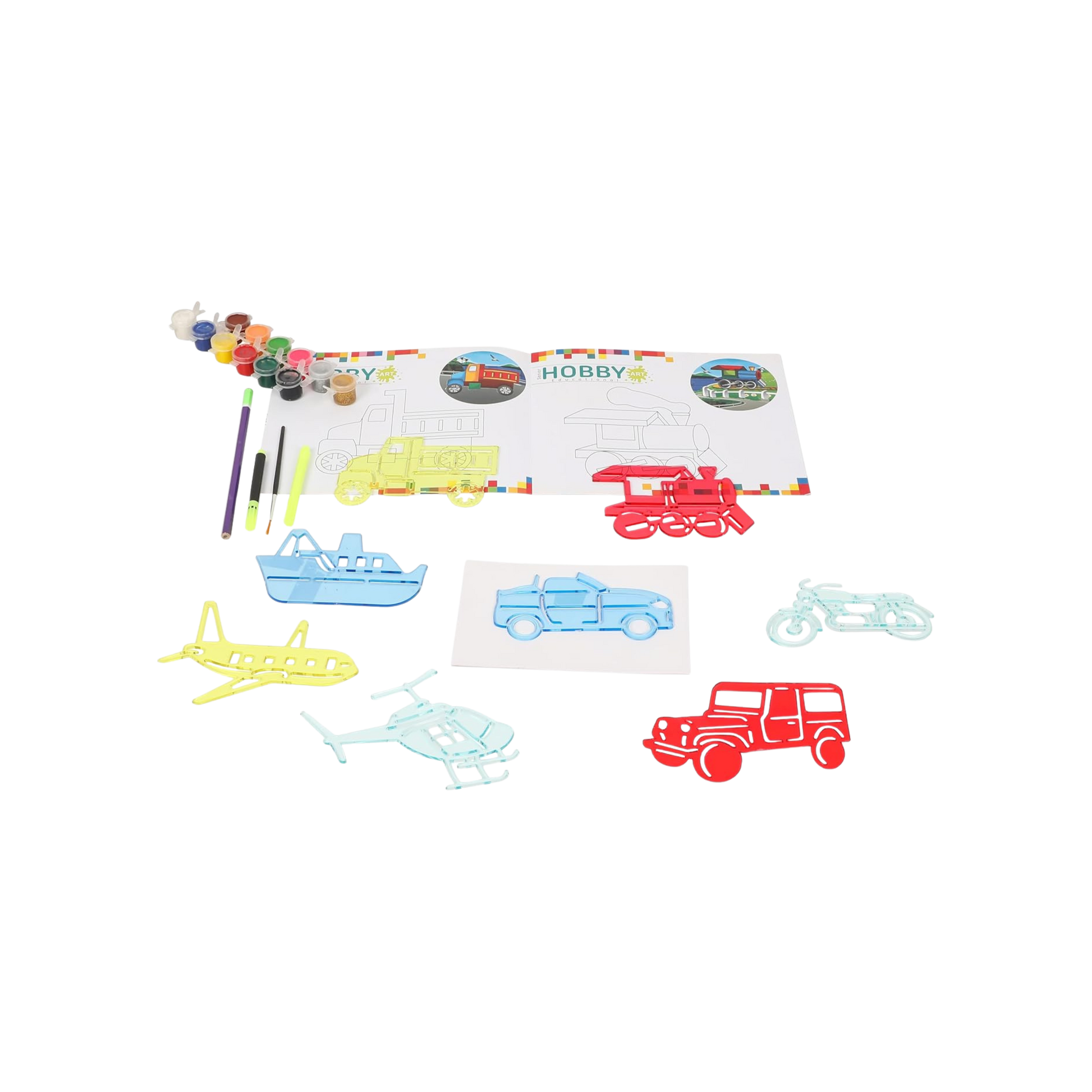 - Kit Includes: 6 vehicle stencils, 1 activity/colouring book, 2 paint brushes, 12 paints
