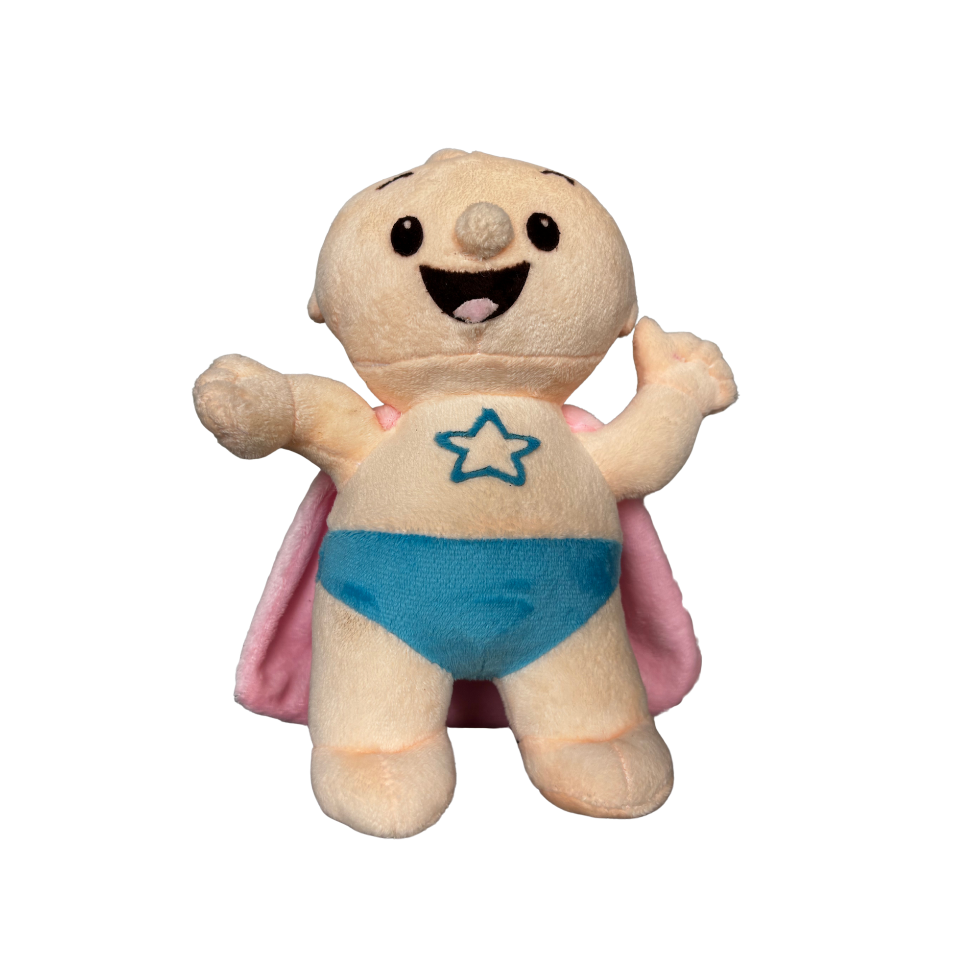 - Heroic Cartoon Style: Iconic baby hero look with blue costume and star motif