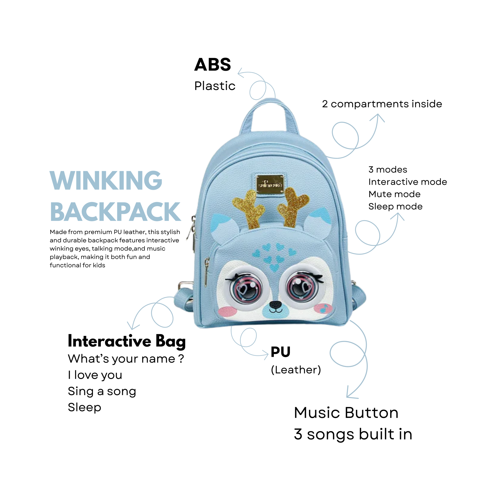 Turn everyday outings into magical adventures with the charming Blue Deer Winking Backpack! Crafted from premium PU leather and accented with glittering antlers, this stylish and durable backpack brings joy to kids with its interactive winking eyes, talking mode, and built-in music playback. Its sweet deer design features big animated eyes, playful heart details, and adorable ears, making it both fun and functional for young children. The backpack includes three modes—Interactive, Mute, and Sleep—for a customized experience, and is sized perfectly for little ones at 23 x 15 cm. Make every day special with this engaging companion that offers entertainment and practical storage in one!