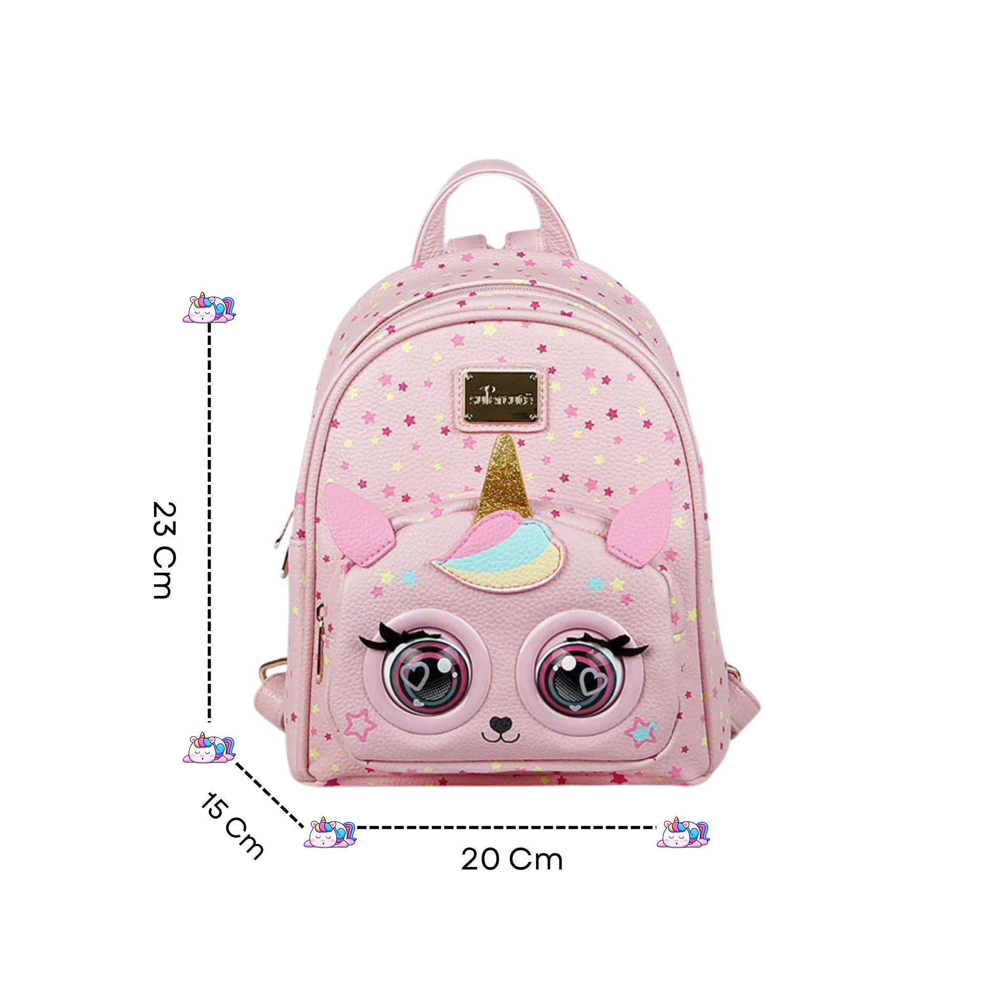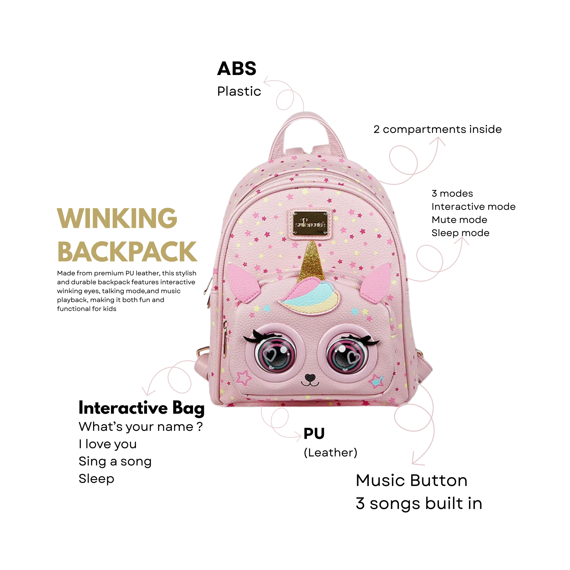 Spark excitement with the Pink Unicorn Winking Backpack! Crafted from premium PU leather and featuring a magical unicorn horn, playful ears, and colorful star prints, this stylish backpack is designed to make every outing extra special for kids. With interactive winking eyes, built-in music playback (3 songs), and fun talking phrases, it keeps children entertained and engaged. Equipped with three modes (Interactive, Mute, Sleep), and two roomy compartments, this backpack combines whimsical design with practical storage. A charming companion for daily adventures, school, or gifting!