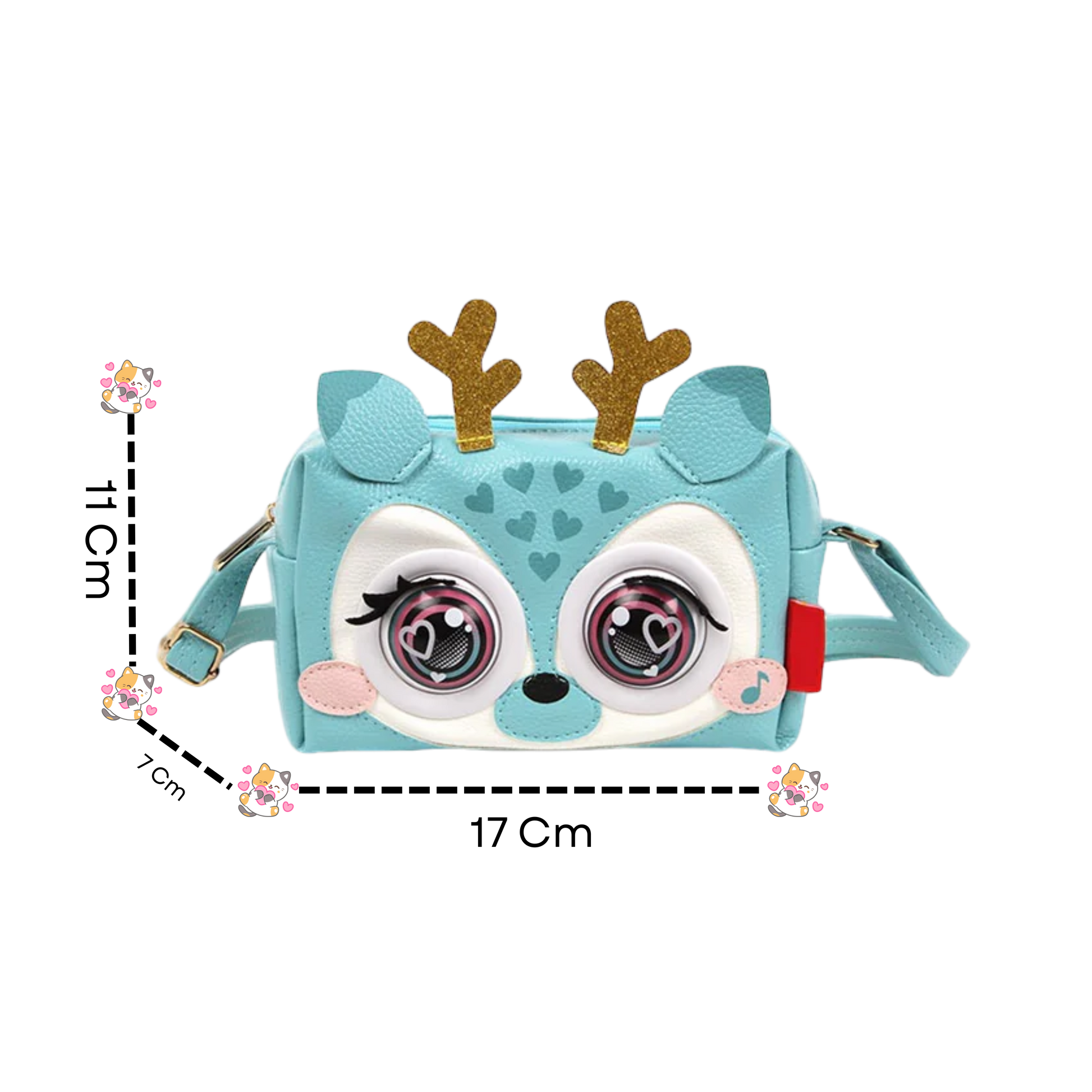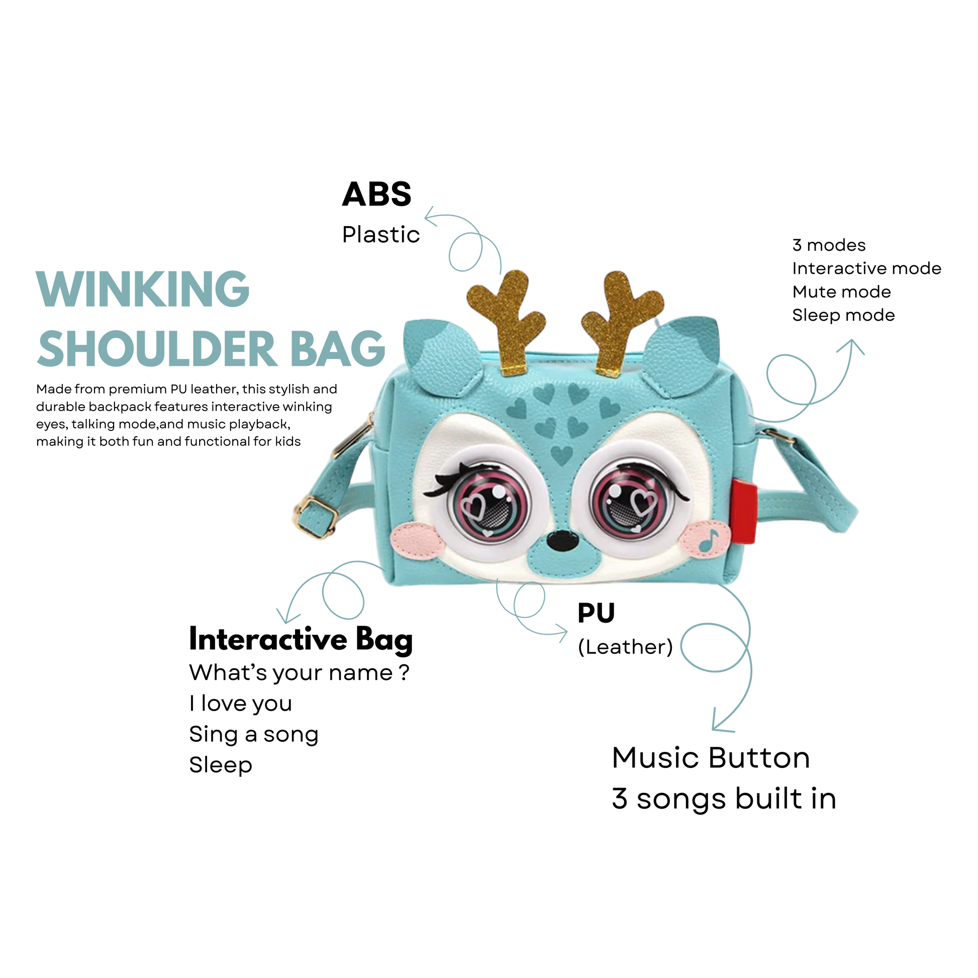 Let kids step out in style with the Blue Deer Winking Shoulder Bag! Made from premium PU leather, this adorable bag features a friendly deer face, glittering gold antlers, and playful hearts. Packed with interactive winking eyes, cheerful talking phrases, and a built-in music button (3 songs included), this bag turns every journey into a fun adventure. With three adjustable modes—Interactive, Mute, and Sleep—plus lightweight comfort, it’s perfect for all-day play or as a memorable gift.