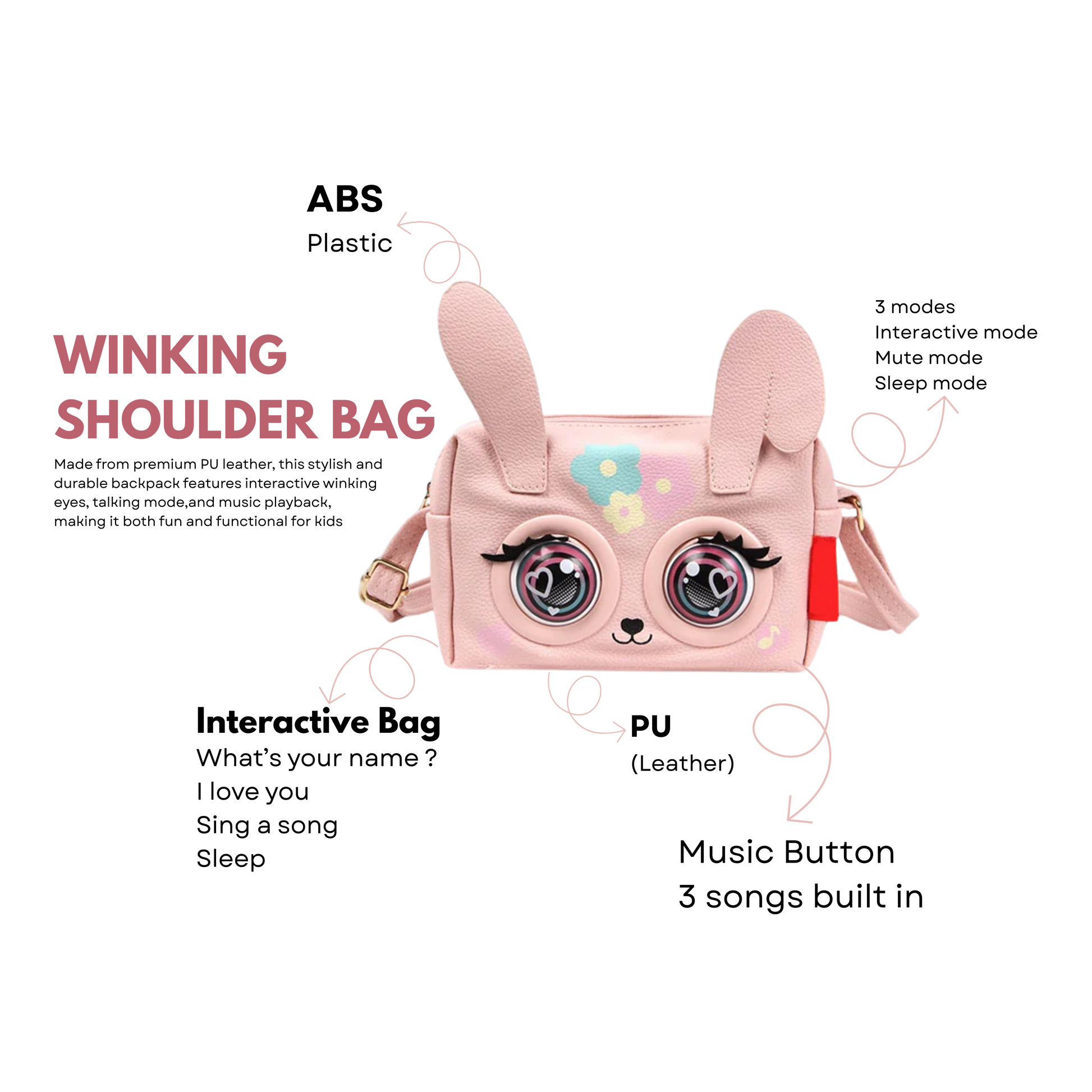 Make every day special with the Pink Rabbit Winking Shoulder Bag! Crafted from premium PU leather, this delightful bag features a charming bunny design with long playful ears, cheerful pastel flowers, and interactive winking eyes for engaging fun. Kids will love the built-in talking mode and music button (3 songs included), making outings more exciting. With three practical modes—Interactive, Mute, and Sleep—plus a lightweight, comfortable strap, this accessory is perfect for little adventurers.