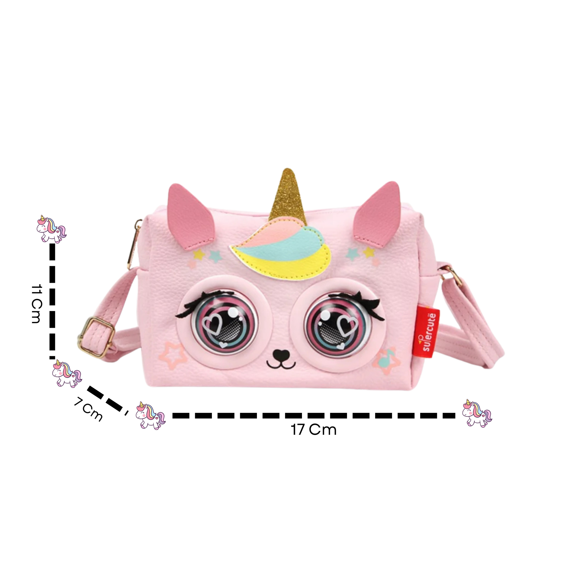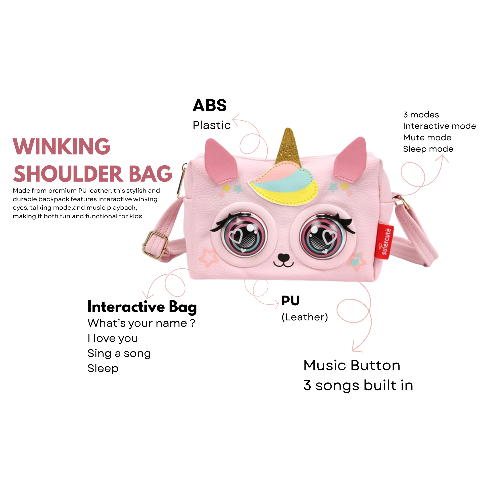 Enchant every outing with the Pink Unicorn Winking Shoulder Bag! Made from premium PU leather, this stylish and durable bag combines a whimsical unicorn design with interactive winking eyes, adorable ears, and a sparkling horn. This bag keeps kids engaged with built-in talking phrases and music playback (3 songs), plus three smart modes: Interactive, Mute, and Sleep. Lightweight yet functional, it’s perfect for carrying essentials and making everyday adventures magical!